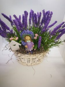 Levendulás tavaszi asztaldísz fonott kosárban